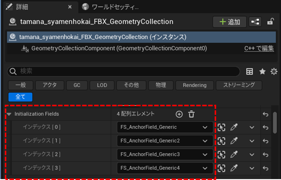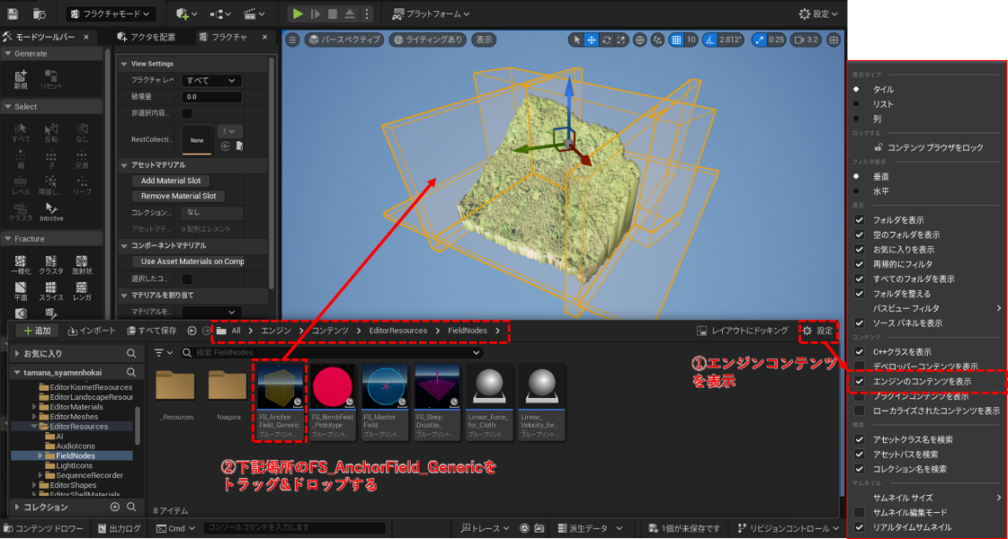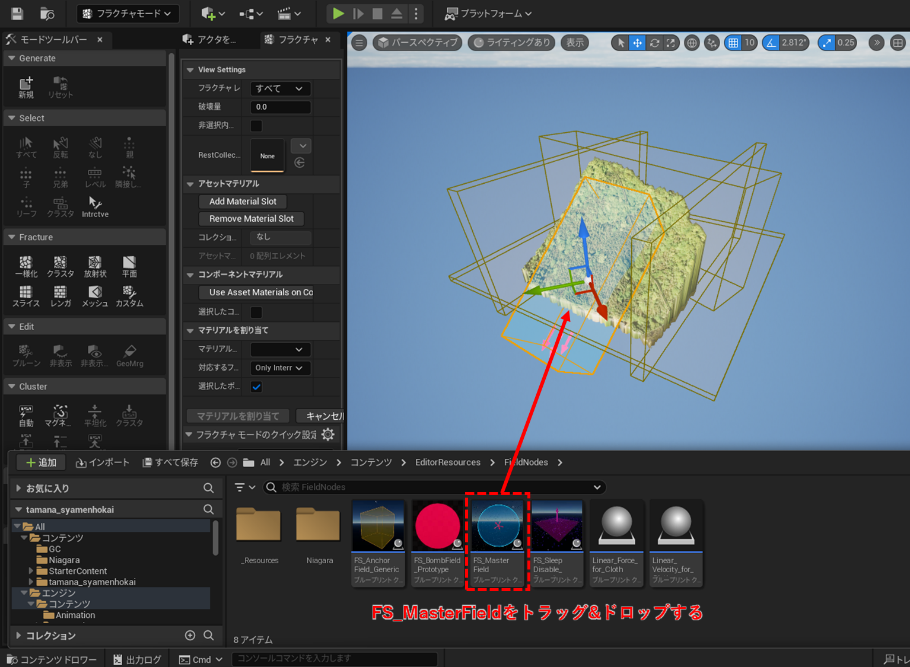 表示されるエンジンフォルダが[エンジン/ コンテンツ/ EditorResources/ FieldNodes]にある、「FS_AnchorField_Generic」をドラッグ&ドロップします。詳細設定のトランスフォームから移動・変形させて、固定したい破片を覆うように設置します。今回は側面3か所と底面に計4つ設置しました。
