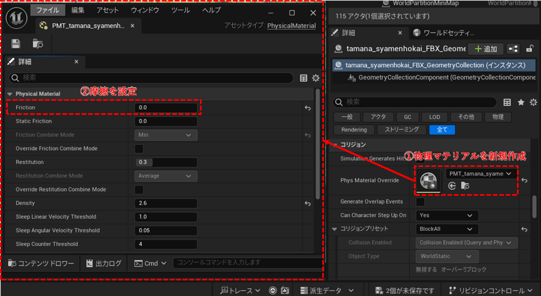 (下図①)ジオメトリコレクションの詳細設定から物理マテリアルを新規作成し適用します。Friction(摩擦)の設定を今回は0.0としました(下図②)。