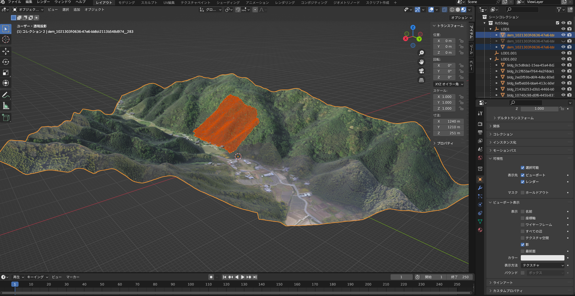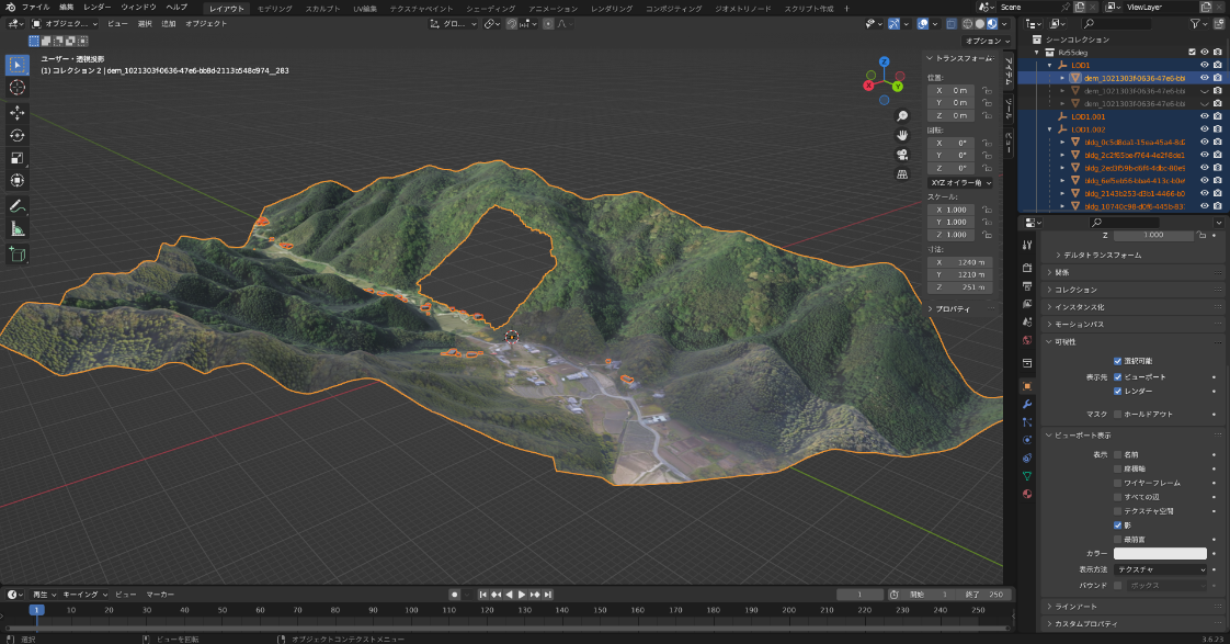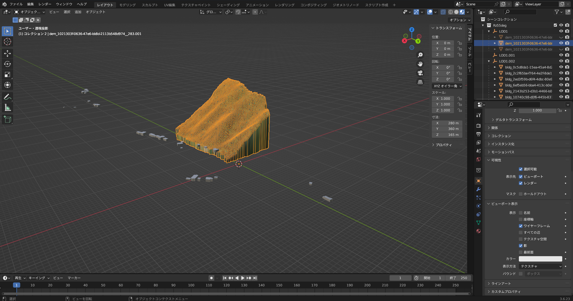 PLATEAU SDKでエクスポートした地形モデルは、下図のように閉じていない3Dモデルとなっています。破壊シミュレーションを実施するためには、閉じた3Dモデルである必要があります。