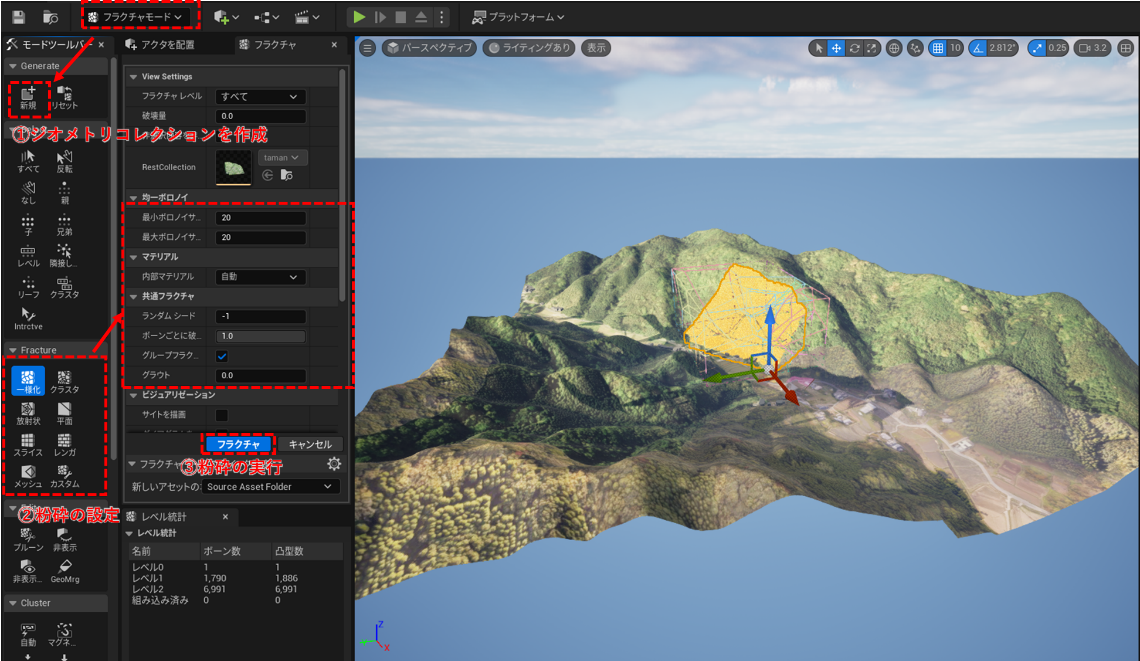 - (下図①)粉砕する3Dモデルを選択して、左上のモード選択ボタンからフラクチャモードを選択します。表示されるモードツールバー内の[Generate/新規]を押してジオメトリコレクションを新規作成します。