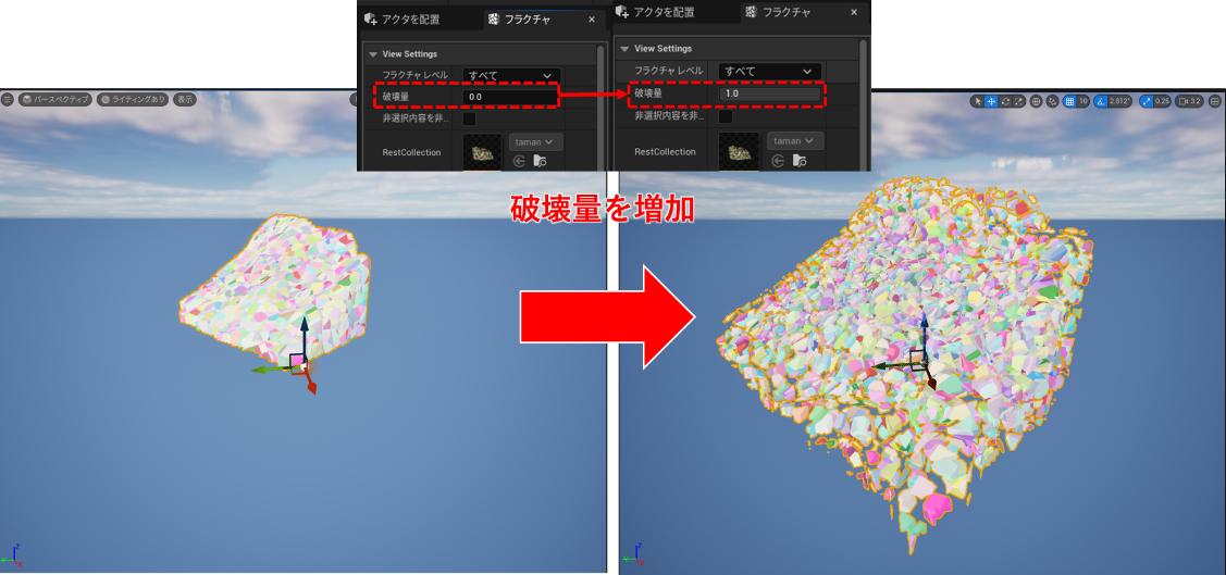 粉砕後は、フラクチャの設定項目にある「破壊量」を調節することで、破片を分離して粉砕状況を確認することもできます。