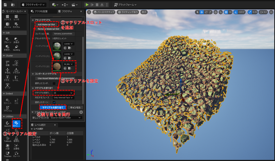 先に紹介した動画では、斜面崩壊を表現するために、UE標準の破壊シミュレーションツールであるChaos Destructionを使用しています。
