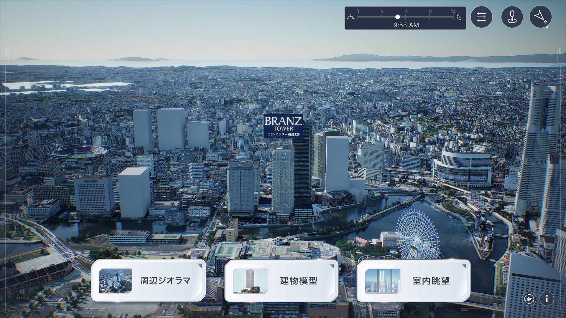 周辺ジオラマとリアルタイムに連動することで時間帯を自由に変更でき、静止画では伝わりにくい眺望の印象を具体的に伝えることが可能です。